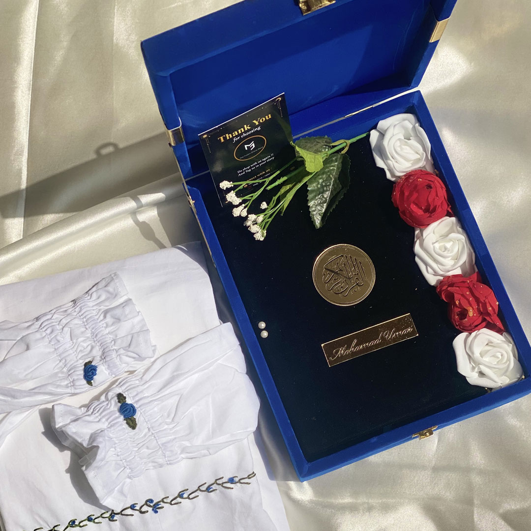 QURAN Â BOX WITH QURAN AND CUSTOMISED PRAYERDRESS.