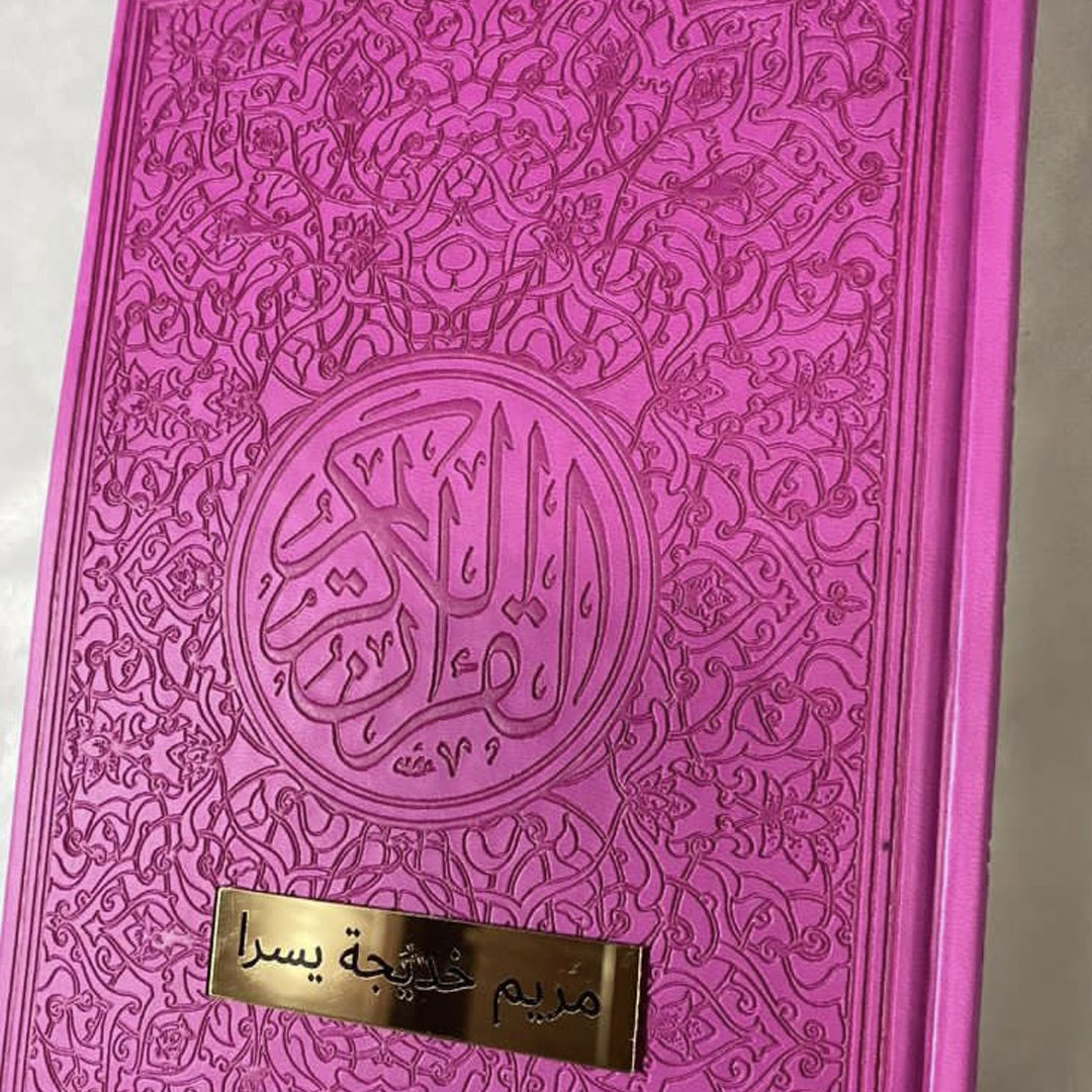 QURAN CUSTOMISED WITH NAME ON IT WITH VELVET COVERING.